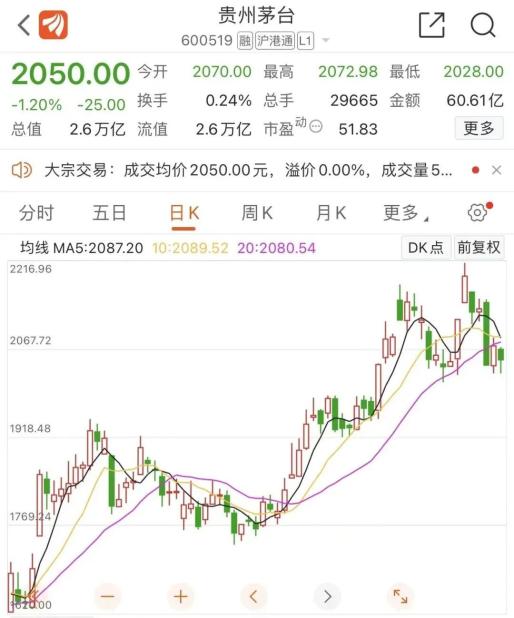 截至2021年12月31日收盘,贵州茅台报收于2050.00元,较2020年末的1979.36元(前复权价)上涨3.57%,市值2.6万亿,仍然稳坐A股股王位置。2021年2月18日,贵州茅台股价最高达2603.37元,最高点相较去年年初最大涨幅达到31.53%,去年8月20日曾触及全年最低点,盘中最低价报1525.50元。