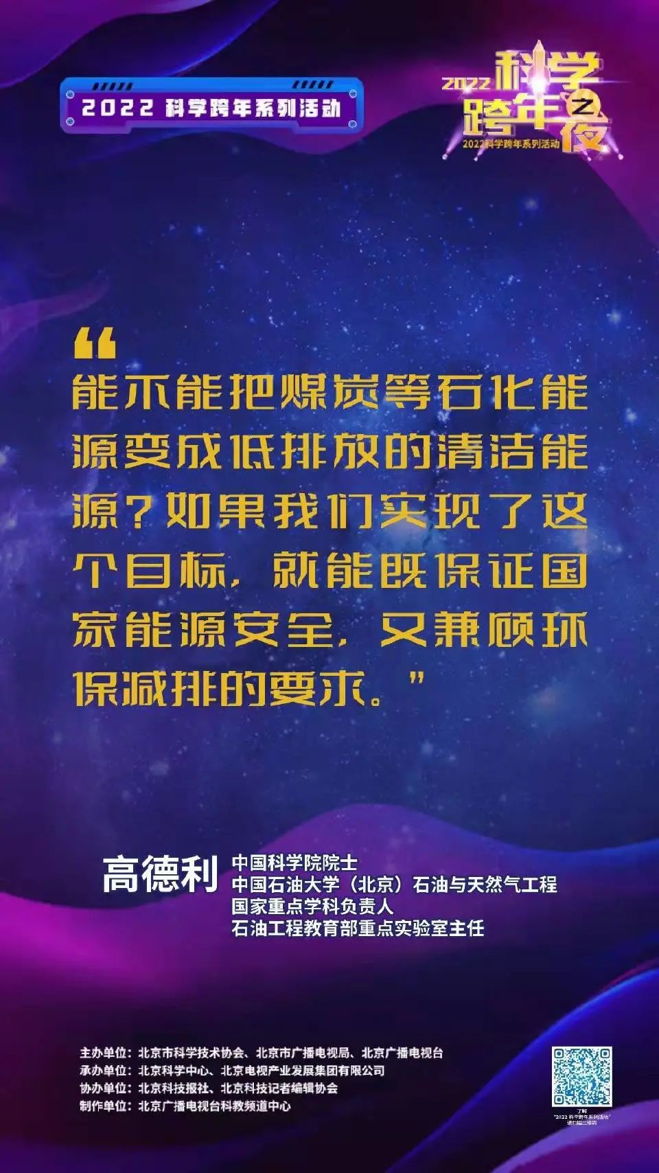 中国科学院院士、中国石油大学(北京)石油与天然气工程国家重点学科负责人、石油工程教育部重点实验室主任高德利登上北京电视台科教频道“2022科学跨年之夜”的舞台,讲述千米之下的“井工厂”如何创造奇迹。