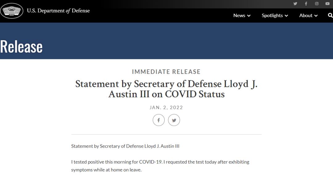 美国国防部官网当地时间1月2日发布了防长奥斯汀的声明。声明称,“我今天早上新冠检测结果呈阳性。我在休假期间出现症状后,今天要求进行检测”,“我的症状很轻,我正在遵照医生的指示。按照这些指示,并根据 CDC 的指导方针,我将在接下来的5天里在家进行隔离”。