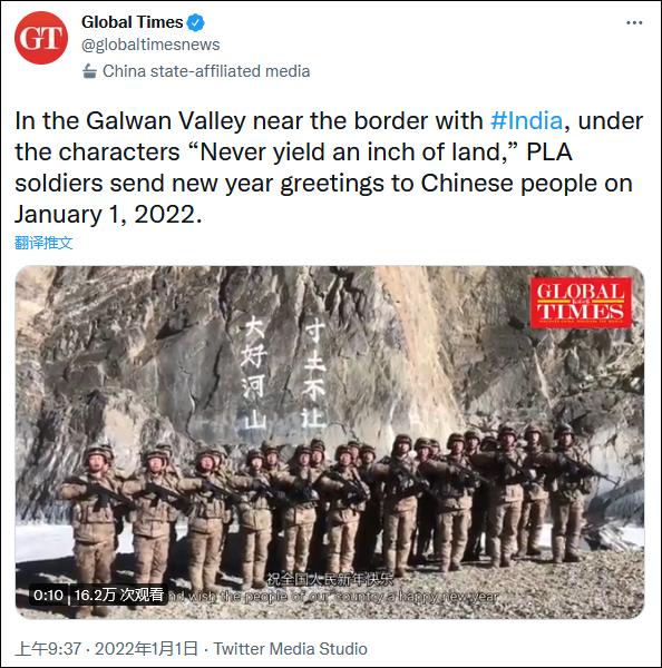 《环球时报》在其推特账号上写道:“2022年1月1日,在中印边境附近的加勒万河谷,在‘大好河山,寸土不让’的字样下,解放军士兵向中国人民致以新年祝福。”
