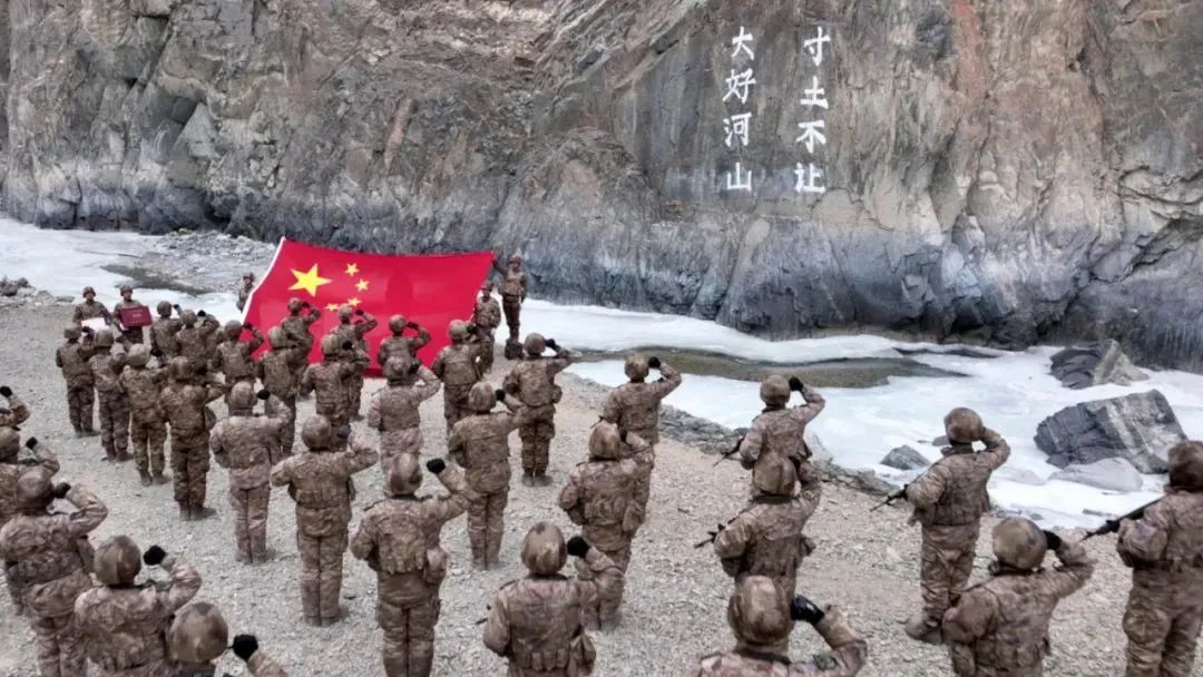 2022年1月1日,新疆军区某部官兵在卫国戍边英雄誓死守卫的中国加勒万河谷展示了一面五星红旗,并在这面国旗前宣誓,再度宣示了中国对于该地区无可争议的主权。