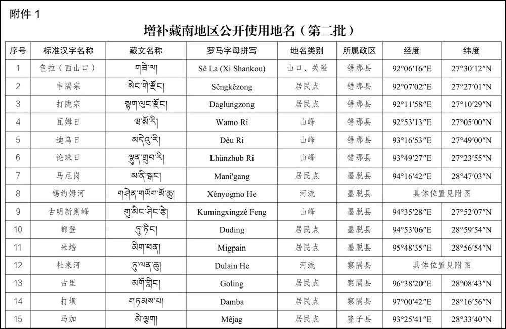 2021年12月29日,民政部网站发布关于增补藏南地区公开使用地名(第二批)的公告称,根据国务院地名管理的有关规定,民政部会同有关部门对我国藏南地区部分地名进行了标准化处理,并正式公布第二批增补藏南地区公开使用地名(共15个)。