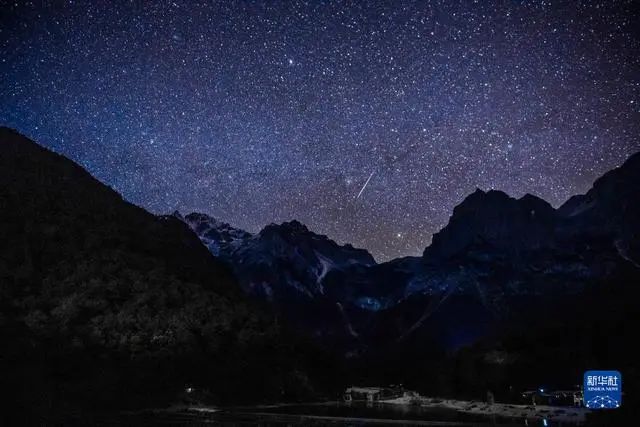 2021年12月14日清晨在云南省丽江市玉龙雪山脚下拍摄的双子座流星雨。新华社发
