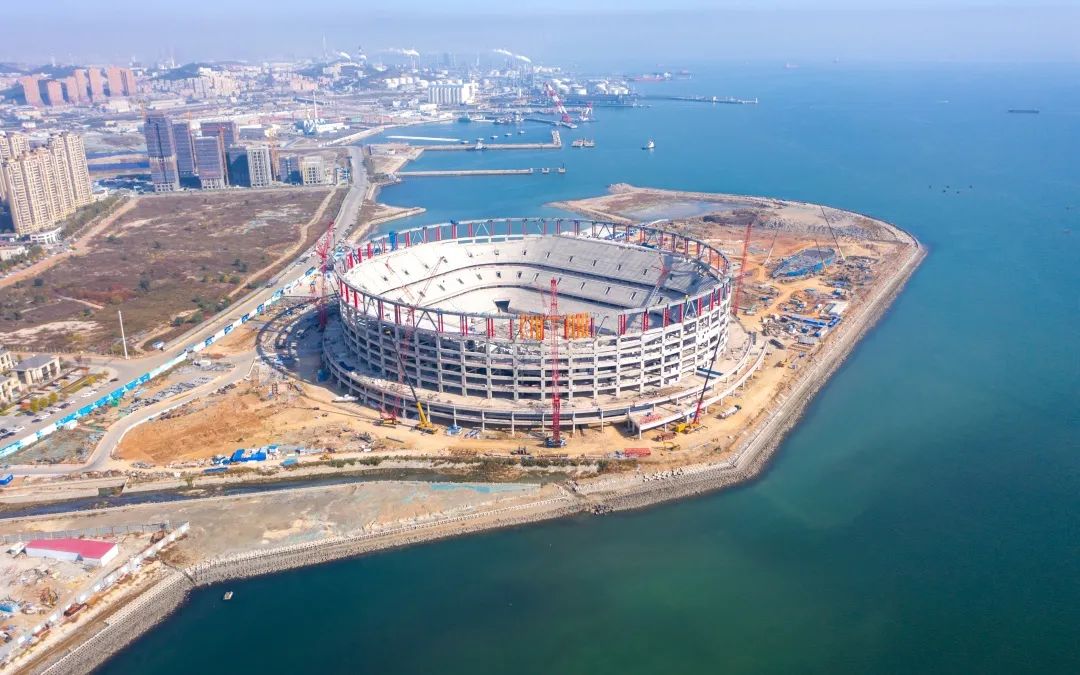 项目位于辽宁省大连市甘井子区梭鱼湾商务区,西、南、东三面环海,拥有270°顶级的观海视野,总建筑面积13.6万平方米,定位为6.3万席位的特级足球场,将在2023年承办亚洲杯大连赛区的足球赛事,是大连首座专业足球场,也是中国首座三面环海的专业足球场,建成后将成为大连新地标。