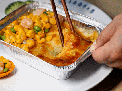 看!一层厚厚奶黄的芝士卧在香喷喷的米饭上,金灿灿的玉米粒炒虾仁毛豆,能狠狠抓住干饭人的心!