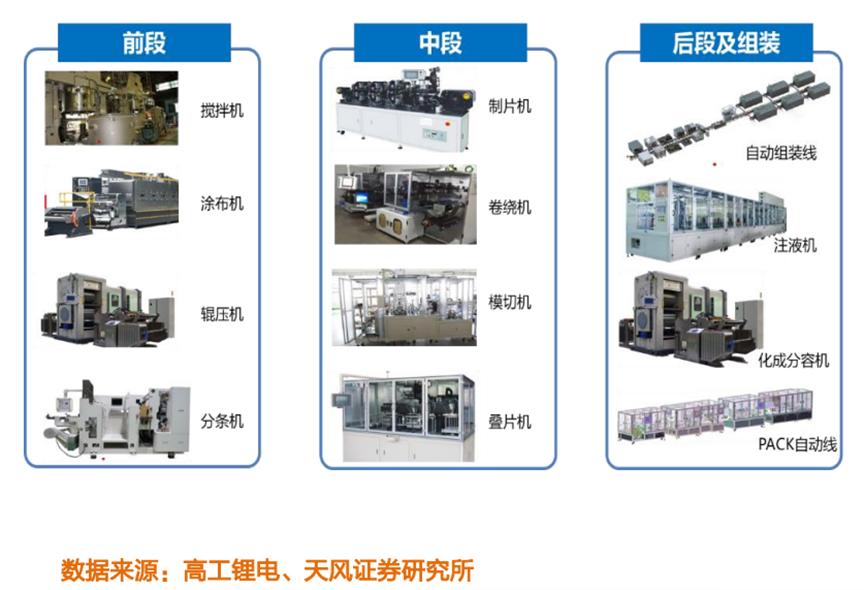 在制作电池的过程中,根据制造先后顺序,可以分为前段、中段、后段三个环节。这三个环节的设备所含价值量大体相等。