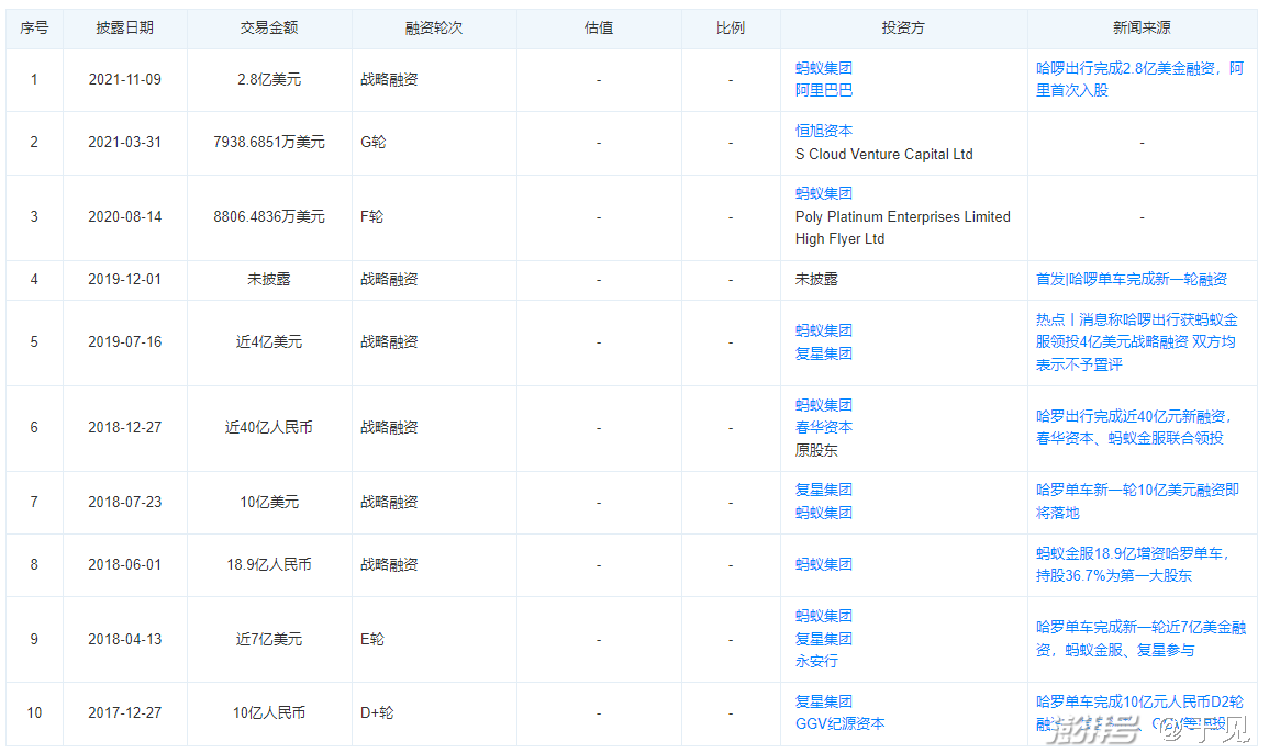 事实上,从天眼查信息来看,哈啰出行的发展,一直都有资本裹挟前行。天眼查信息显示,从2017年12月底到2021年11月共计进行了10轮融资,已披露的融资金额总额超16000亿美元。10轮融资中,蚂蚁集团参与7轮,复星集团、春华资本、恒旭资本相继入局。