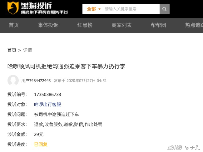 各大投诉平台上都有关于司机服务不到位或是客服面对用户问题不作为的投诉。新京报报道,哈啰顺风车人车匹配难,不少用户使用哈啰顺风车时发现,平台车源非常少并且行程能够匹配的成功率很低,常常面临无人接单的问题。更有某用户在黑猫投诉平台指出顺风车司机存在拒绝沟通强迫乘客下车暴力扔行李的无礼行为。