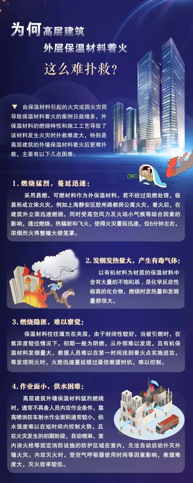 由保温材料引起的高层建筑物火灾或因火灾而导致保温材料着火的案例日益增多,外保温材料的燃烧特性和施工工艺导致了该材料发生火灾时扑救难度大,特别是高层建筑的外墙保温材料着火后更难扑救。