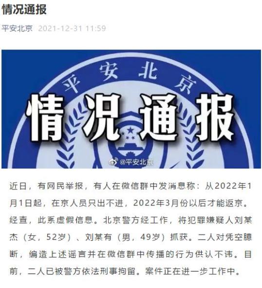 近日,有人在微信群中发布“从2022年1月1日起,在京人员只出不进,2022年3月份以后才能返京“等不实信息。北京警方经工作,将犯罪嫌疑人刘某杰(女,52岁)、刘某有(男,49岁)抓获。二人对凭空臆断,编造上述谣言并在微信群中传播的行为供认不讳。目前,二人已被警方依法刑事拘留。