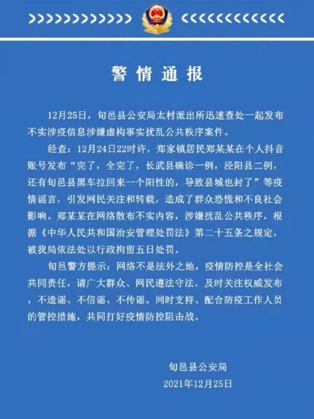 2021年12月25日,郑某某在个抖音账号发布“完了,全完了,长武县确诊一例,泾阳县二例,还有旬邑县黑车拉回来一个阳性的,导致县城也封了”等疫情谣言,引发网民的关注和转载,造成不良的社会影响,旬邑县公安局依据《中华人民共和国治安管理处罚法》第二十五条之规定,给予郑某行政拘留五日的处罚。