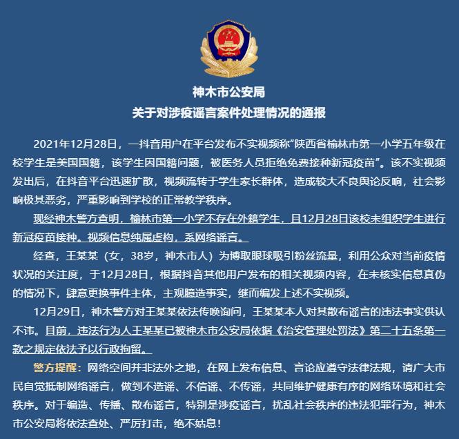 2021年12月28日,王某某(女,38岁,神木市人)为博取眼球吸引粉丝流量,利用公众对当前疫情状况的关注度,平台发布不实视频称“陕西省榆林市第一小学五年级在校学生是美国国籍,该学生因国籍问题,被医务人员拒绝接种新冠疫苗”。违法行为人王某某已被神木市公安局依据《治安管理处罚法》第二十五条第一款之规定依法予以行政拘留。