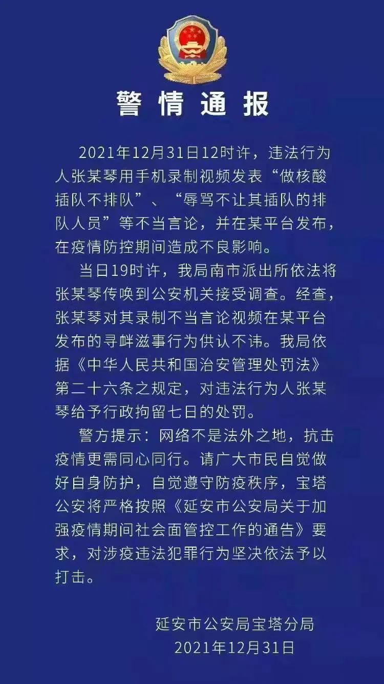 2021年12月31日,张某某用的机录制视频发表“做核酸插队不排队”、“辱骂不让其插队的排队人员”等不发言论,并在某平台发布,造成不良影响。延安市宝塔分局根据《中华人民共和国治安管理处罚法》第二十六条之规定,给予张某某行政拘留七日。