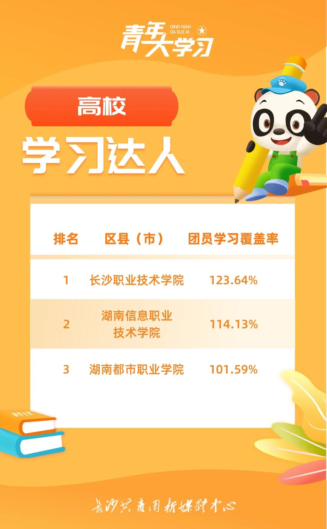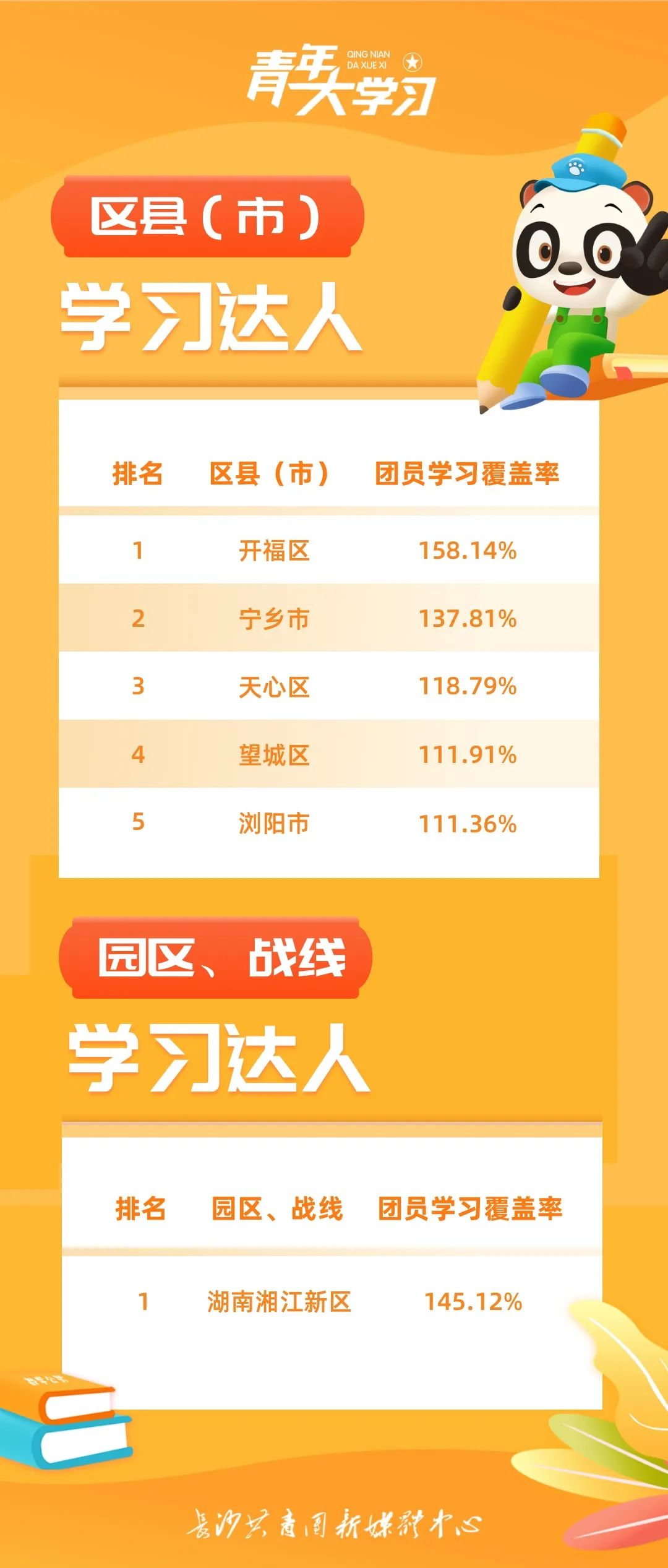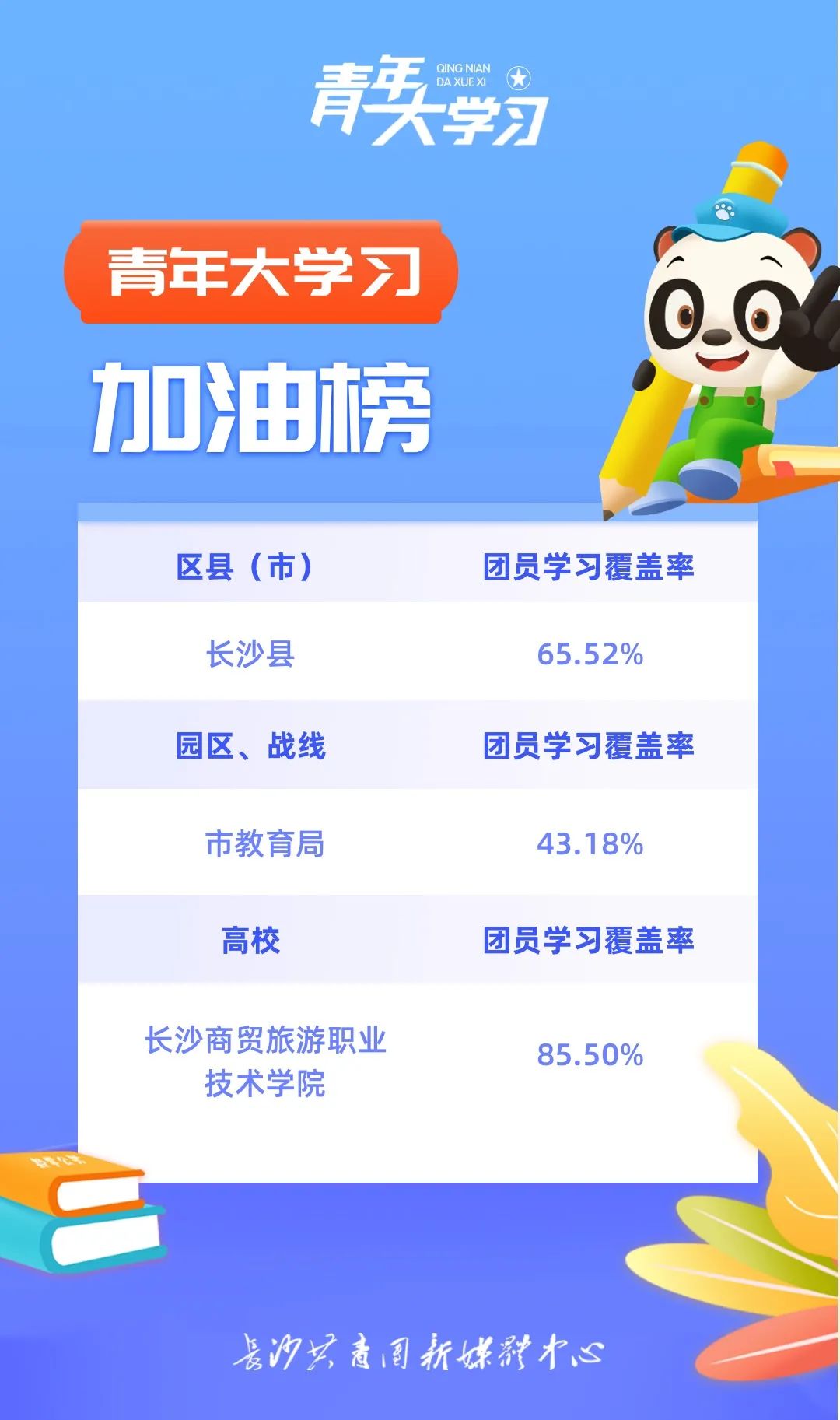 在上一期网上团课中,全市各级团组织发动22.7万团员青年参与学习,全省排名第2名,开福区、宁乡市、天心区、望城区、浏阳市、湖南湘江新区、长沙职业技术学院、湖南信息职业技术学院、湖南都市职业学院、学习率均超过100%,其中开福区团员学习覆盖率达158.14%,特此提出表扬。