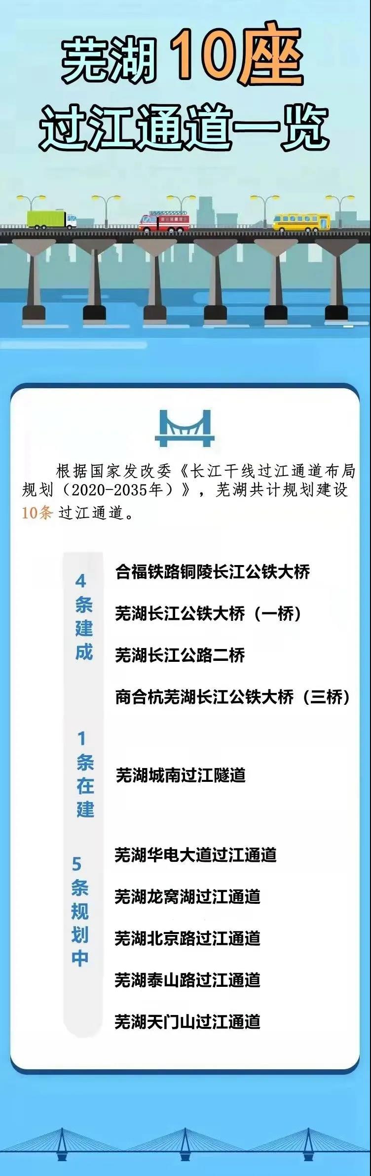 随着芜湖长江大桥一桥、三桥的建成通车,芜湖从沿江发展模式向跨江发展模式在过江通道上发生了质的跃迁。市发改委基础科科长朱江介绍说,根据国家发改委发布的《长江干线过江通道布局规划(2020-2035年)》,芜湖共计规划建设10条过江通道,大幅提高跨江交通能力,提升城市交通品质,对推进芜湖“拥江发展”、促进芜湖市长江两岸经济社会协调发展、加快长三角一体化高质量发展具有重要意义。