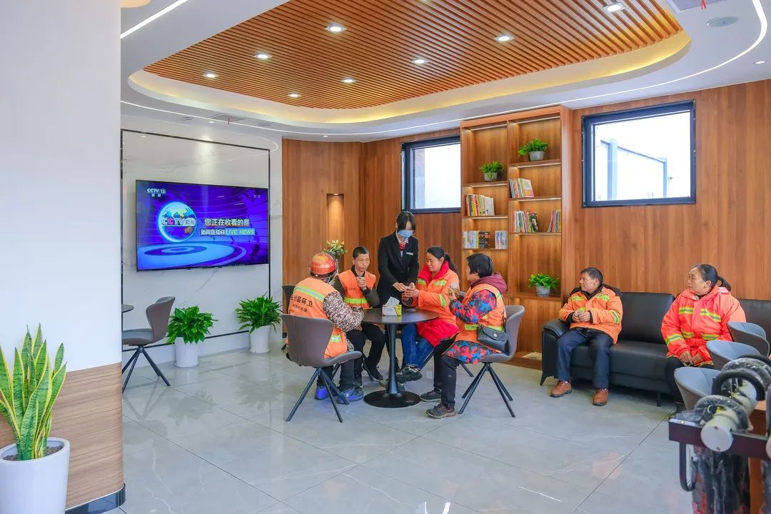 驿站使用现代简约装修风格,设置了休息室、阅读区、男女卫生间、母婴室,配备了空调、新风系统、液晶电视、冰箱、微波炉等便民设施,可供市民和一线劳动者休息交流、方便志愿者开展志愿服务。