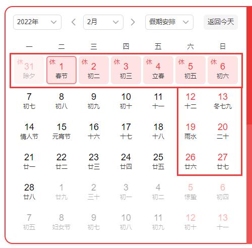 二、周末:2月12日、13日、19日、20日、26日、27日休息,共6天。