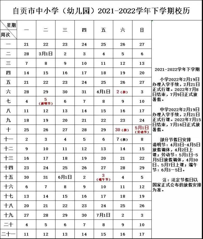 自贡市小学(幼儿园)寒假从2022年1月15日开始到2月17日结束,中学寒假从2022年1月22日开始到2月17日结束。