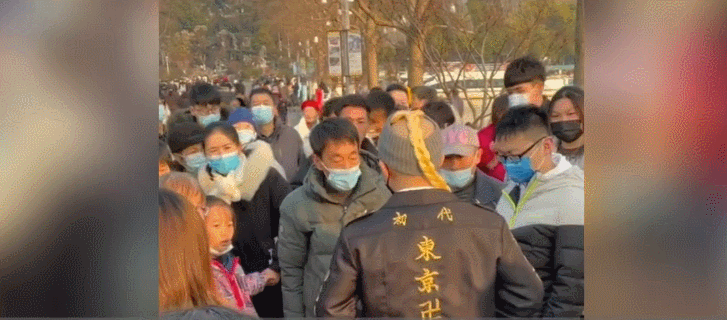 之后,该年轻男子脱下背面印有“初代”、“东京卍会”等字样的黑色外套。老人则伸手拿着外套一角,指着其上的字样对年轻男子说着什么,其间也有女游客跟该男子说“不能穿”。最后,该年轻男子又将脱下的外套叠起,对着身旁的游客说“那我把这个挡着”。