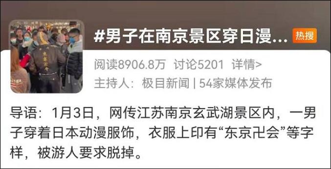 而随着相关视频的传播与媒体报道,此事逐渐在网上引发争论,“男子在南京景区穿日漫服饰被要求脱下”的话题在今日冲上热搜。截至17:30,该话题阅读量已突破8906万次。
