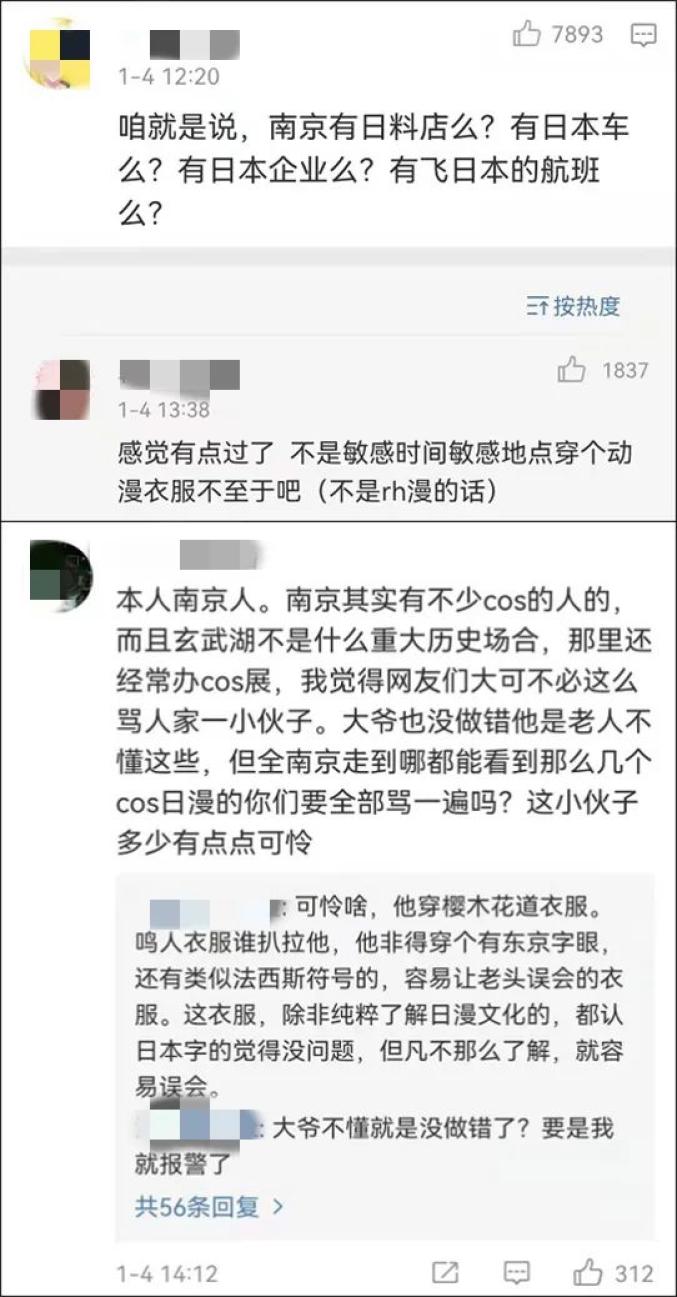 但同时,也有不少网友指出,玄武湖景区并非重大历史纪念场所,对于穿日漫服饰年轻人,不至于要让其当众脱衣。还有网友表示,只要不在南京大屠杀遇难同胞纪念馆等特殊场合与时间节点穿日漫服饰就行,其他地点没必要“小题大做”,扩大化事态。