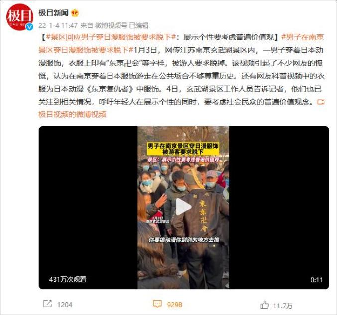 原标题:《男子穿日漫服饰被游客要求脱下,南京景区回应》