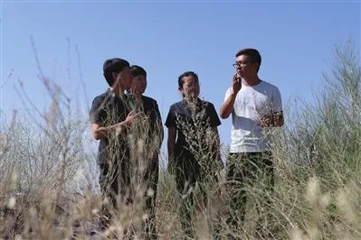 2021年9月2日,银川铁路运输法院法官在灵武市白芨滩国家级自然保护区向工作人员学习沙漠植物补种复绿。