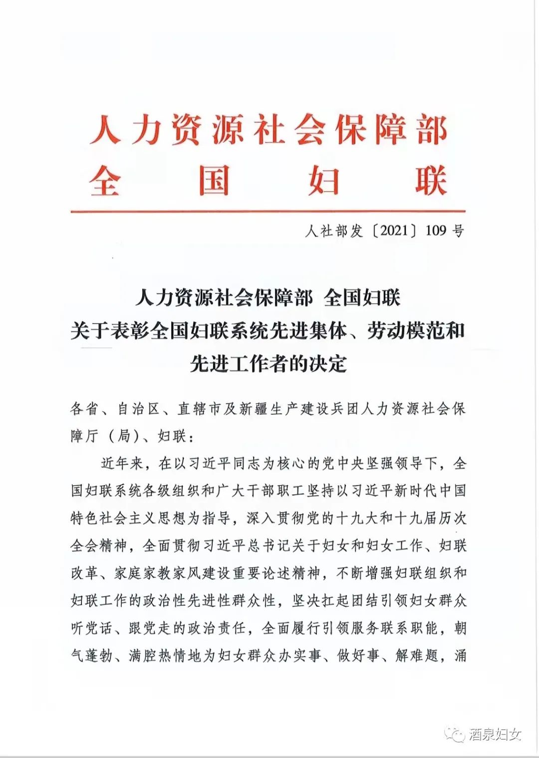 根据人力资源社会保障部 全国妇联《关于表彰全国妇联系统先进集体、劳动模范和先进工作者的决定》,授予150个单位“全国妇联系统先进集体”称号,授予100名同志“全国妇联系统劳动模范”称号,授予100名同志“全国妇联系统先进工作者”称号,酒泉市妇联荣获“全国妇联系统先进集体”称号。