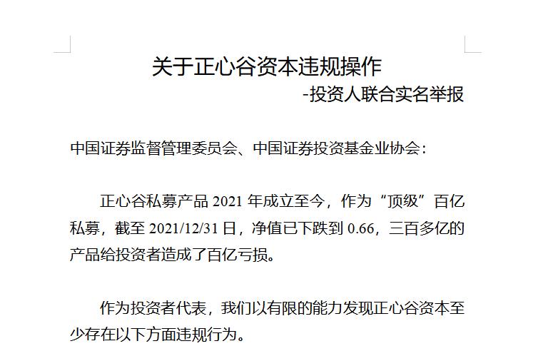 网传举报信在开头指出:“正心谷私募产品2021年成立至今,作为‘顶级’百亿私募,截至2021/12/31日,净值已下跌到0.66,三百多亿的产品给投资者造成了百亿亏损。”