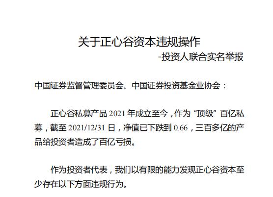 根据这份流传开来的举报信,多名正心谷的投资人举报,截至2021年12月31日,正心谷私募产品净值已下跌到0.66,300多亿的产品给投资者造成了百亿亏损。举报的投资人认为,正心谷至少存在以下三方面违规行为: