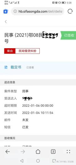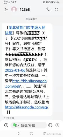 1月4日10:11分,送达专员借助“12368”向当事人发送了带有文书链接的短信。须臾,当事人便收到短信提示,按照操作即可随时随地查收裁判文书。相关当事人表示,通过电子方式接收裁判文书,秒接收、不跑腿,切实感受到了人民法院与时俱进的态度和司法为民的温度。