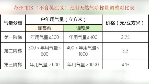 苏州市区的天然气民用户,也从本月起提高分档气量标准。家庭人口为4人及以下用户的,第一阶梯气量调整为每年0至400立方米,第二阶梯气量调整为每年400至1000立方米,第三阶梯气量调整为每年1000立方米以上。家庭人口超过4人的,每增加1人,在家庭人口4人用量的基础上,每档相应增加年用气量80立方米。