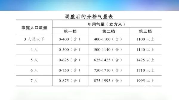 镇江市区的天然气用户,家庭人口为4人及以下的,第一阶梯气量调整为每年0至400立方米,第二阶梯气量调整为每年400至1100立方米,第三阶梯气量调整为每年1100立方米以上。同一户籍家庭人口超过4人的,每增加1人,年度一、二档阶梯气量基数分别增加100立方米和175立方米。
