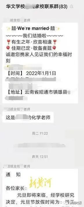 元旦前几天,云南省镇雄县华文学校一班主任老师,在家长群里替另外一即将结婚的老师发了请柬,并告诉家长这是他们班级化学老师的婚礼。班主任老师还告诉学生如何坐车到达婚礼现场,并称“有空的家长陪同孩子去玩一下”。很多家长考虑到孩子还要在学校上学,大家都在群里发了红包,班主任也均一一代收。