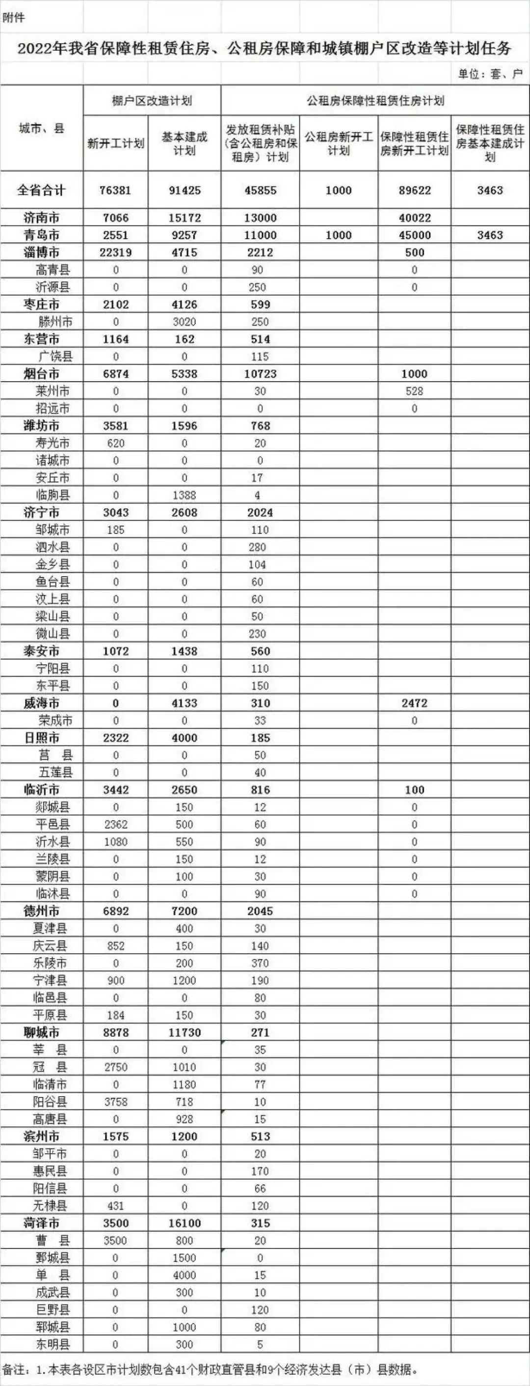 近日,山东省住房城乡建设厅发布关于公布2022年我省保障性租赁住房、公租房保障和城镇棚户区改造等计划任务的通知。