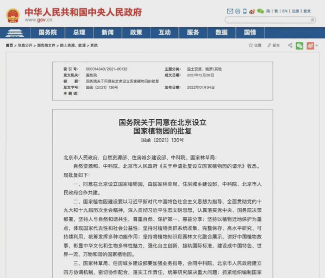 2022年1月4日,据中国政府网消息,国务院已批复同意在北京设立国家植物园。