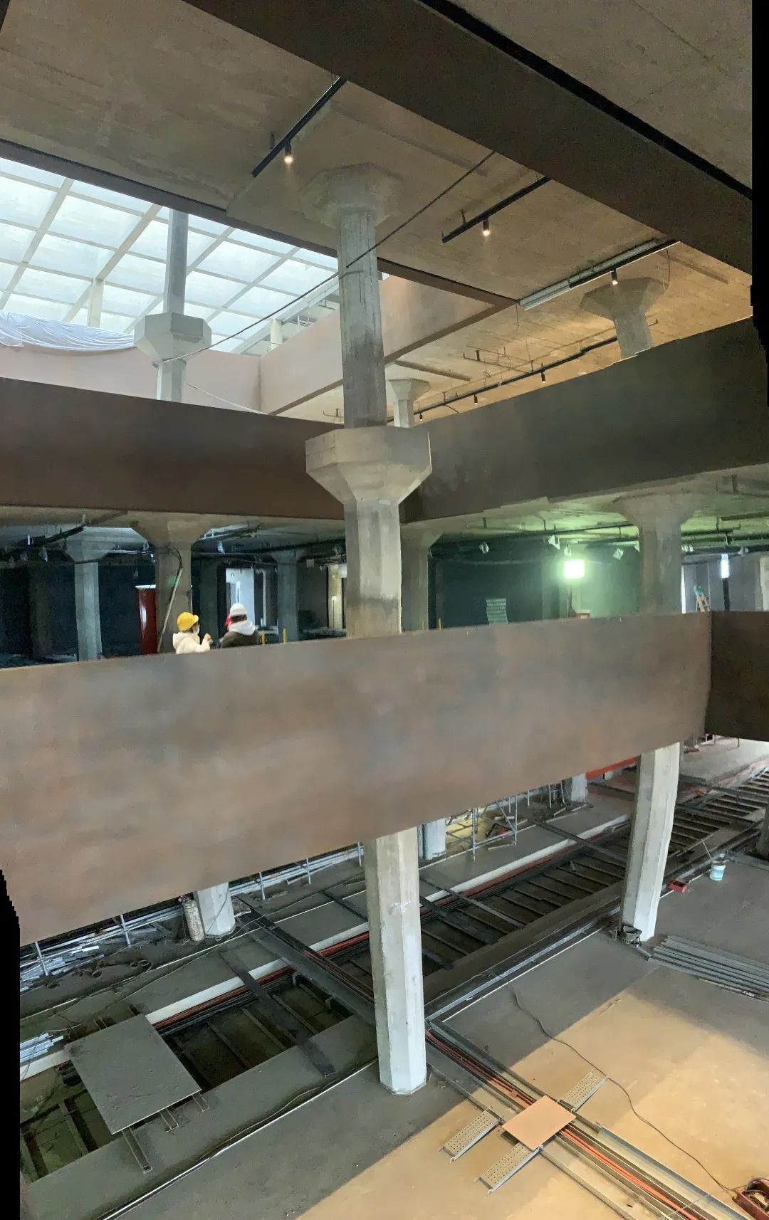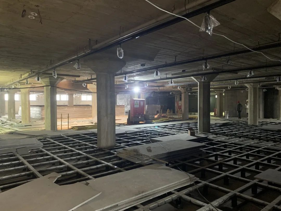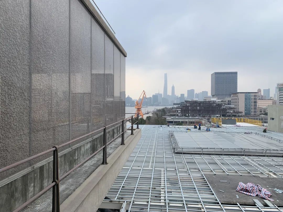 照明系统也已经安装完毕,并已分时分区进行灯光调试工作。与此同时,建筑内部的油漆作业也进行得有条不紊。锈色的漆墙包裹的不是水泥墙体而是一块块钢板,这些都是根据展陈最新方案,进行的装修布置。来到顶层屋面,多位师傅在进行屋面地板龙骨的拼装,完成后在龙骨上铺装地板并加装栏杆。