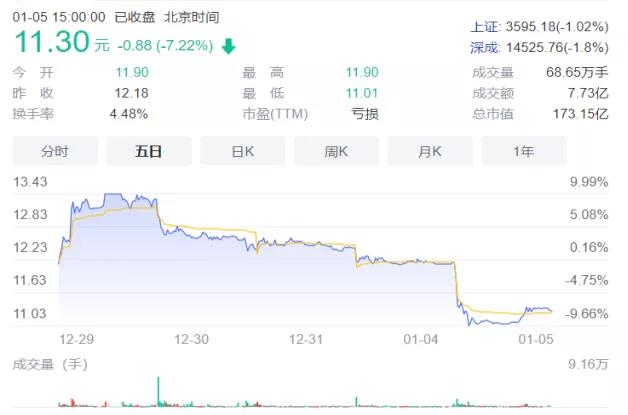 1月5日开盘,延安必康股价迅速下跌,截至收盘其股价报收11.30元股,跌幅为7.22%。