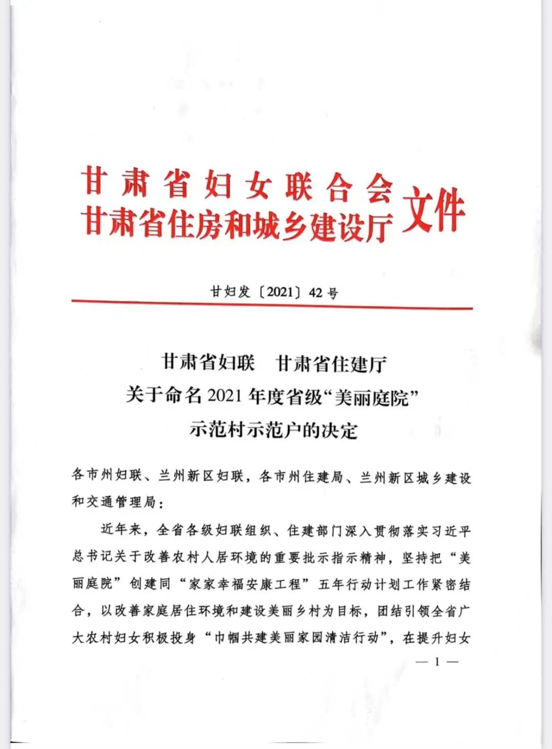 近日,为树立典型、彰显作为,省妇联、省住建厅决定,命名全省100个村为省级“美丽庭院”示范村,1000户家庭为省级“美丽庭院”示范户。我市市县乡层层创建,其中,我市武都区桔柑镇贺家坪村等10个村荣获省级“美丽庭院”示范村荣誉称号;潘春平家庭等100户家庭荣获省级“美丽庭院”示范户荣誉称号。