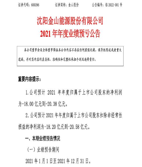 1月5日晚间,金山股份发布公告表示,经公司财务部门初步测算,预计2021年年度归属于上市公司股东的净利润为-18.00亿元到-20.38亿元,与上年同期(法定披露数据)相比,将减少金额约为18.82亿元到21.20亿元。