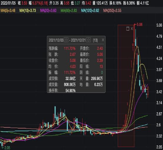 值得注意的是,受电力板块的影响,金山股份在12月份曾经历一波快速猛涨,期间连拉7涨停,13个交易日股价大涨112%。不过,随后股价再度回落。截至1月5日收盘,该股报3.53元,总市值为51.99亿元。