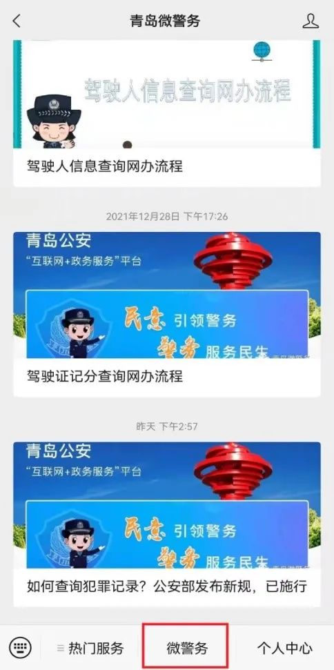 2.实人认证完成后,回到公众号首页,点击底部“微警务”按钮,进入微警务首页