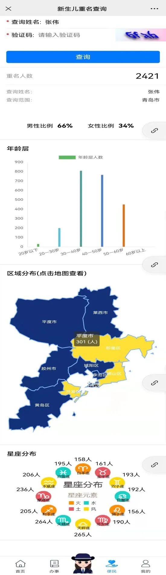 5.查询成功后会显示该姓名的重名人数、年龄层、区域分布、星座分布