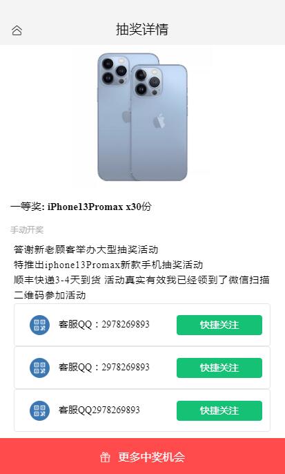 不谙世事的小姑娘信以为真,点击进入后,真的抽到了一台苹果13,上面有三个QQ客服,套路开始一步步逼近开演,小姑娘加其中一个QQ号2978269893;