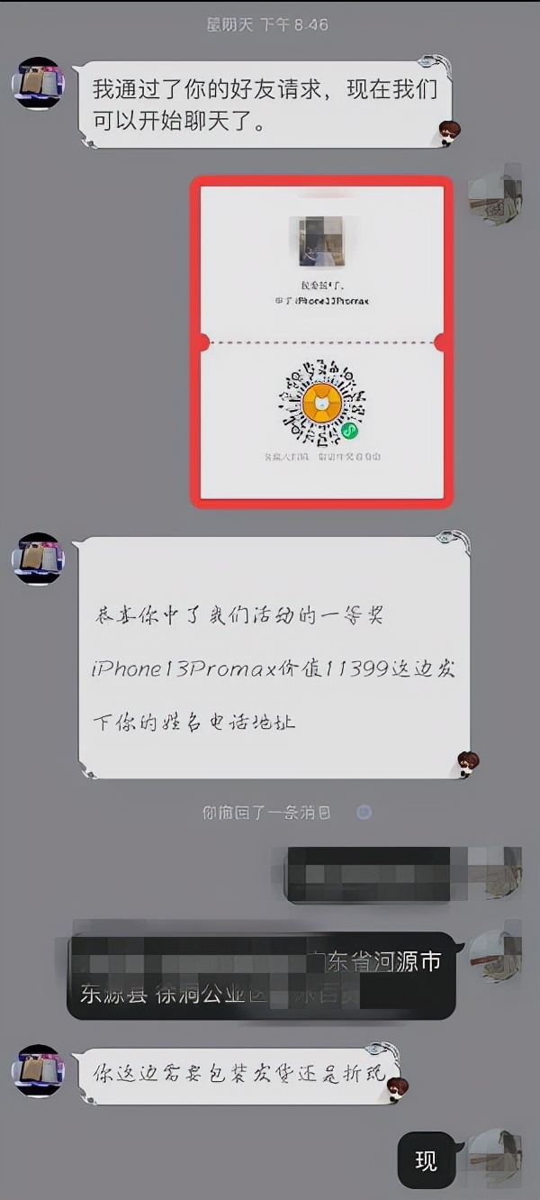 小姑娘添加对方QQ号码后,苹果13的手机没有拿到,被骗子以199元的押金,688的折现费,3000元虚拟二维码收款,3000元保证金一步步套住,直至榨干小姑娘口袋看病的钱才罢休。