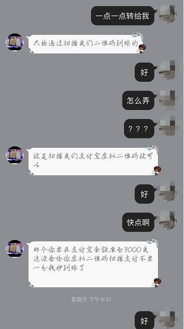 骗子:那个你要在支付宝余额准备3000我这边会给你虚拟二维码扫描支付不要一分钱秒到账了。
