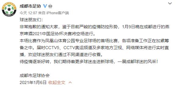 2022年1月9日,将在作为2023中国亚洲杯8个新建专业球场之一的成都凤凰山体育公园专业足球场上演最后的冠亚军对决,打进决赛的山东泰山队与上海海港队将争夺2021年足协杯赛冠军奖杯。这也是成都时隔多年再次举办国内大型足球赛事。