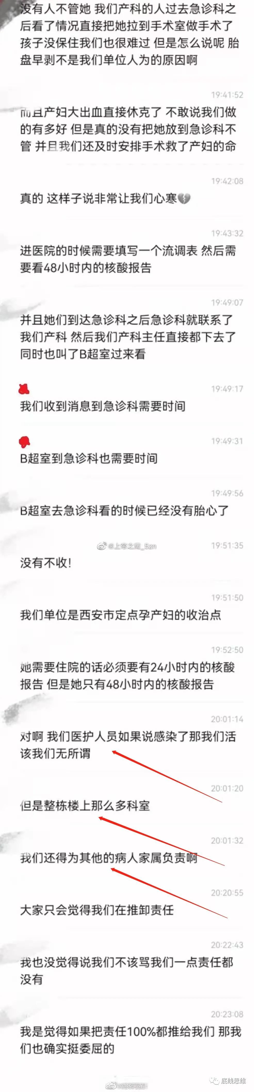 西安孕妇时间后,在社交媒体上有知名博主贴出据称是涉事医院医务人员的聊天记录。然而这一聊天记录却再次引发了笔者的焦虑。该聊天记录称,孕妇在“确认24小时核酸检测结果”和“填写流调表”耗费了一些时间。同时该“医务人员”表示贸然收治“黄码病人”会导致疫情在医院内传播扩散。