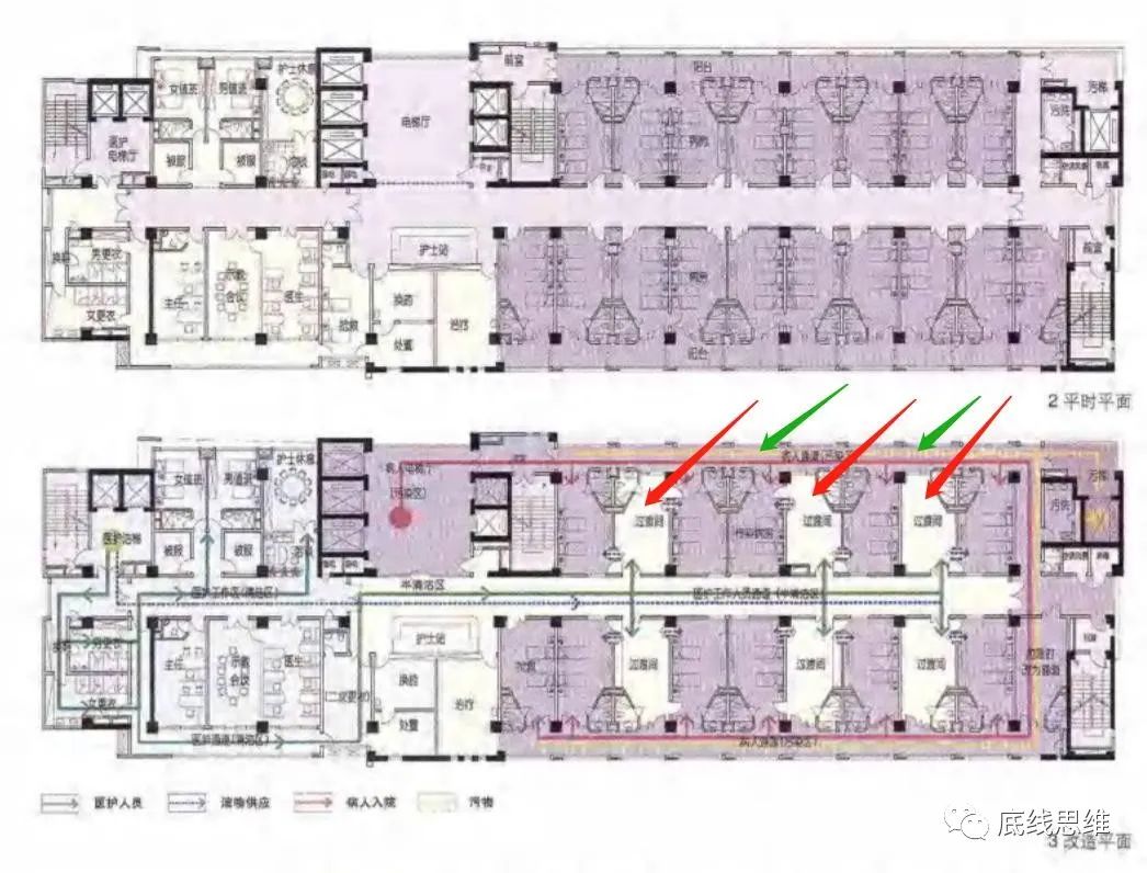 以吸取了“非典”经验教训、于2009年落成的广东省第二人民医院(广东省应急医院)应急备用病区为例,该病区日常用于收治非感染病人,一旦暴发疫情可以迅速改造为传染病隔离病房。病房阳台打通即成为病人通道,原先的病房走廊用于半污染区医务人员通道;部分病房则可以改为过道间“缓冲区”。当然,这一设计在日常使用过程中的维护成本显然要高于普通病房楼。