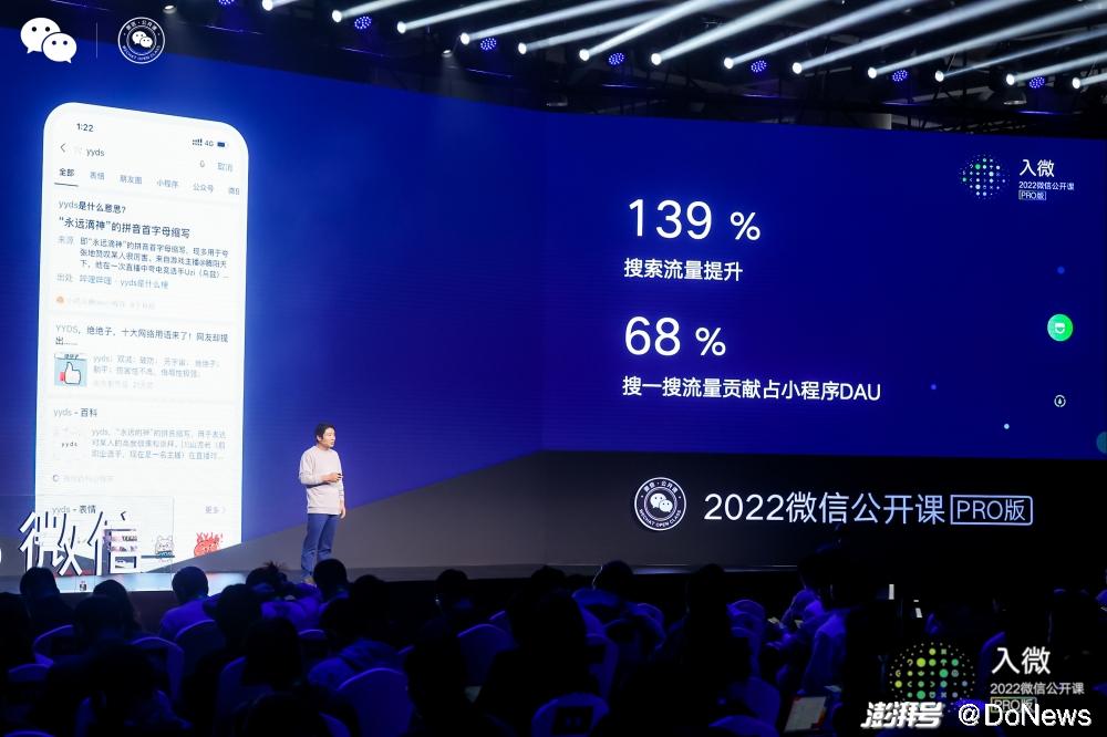 搜一搜的目标是由用户需求所驱动,因此,搜一搜持续优化的目标是“用微信,搜所有”。不仅仅包括微信体系之内生产的“内容”,也是包括在生态之外所产生,但是接入到生态海量的内容。比如对网络流行语的查询——YYDS到底是什么意思?小鸡辞典这方面的内容,就通过小程序的触点接入到微信的生态,优化之后使得用户端和B端都得到满足,这个类目下搜索的需求增长了139%,也为小程序贡献了68%的日活用户。